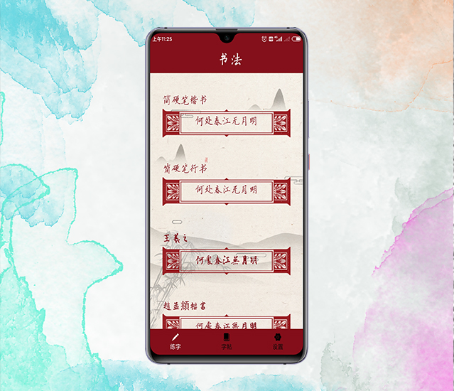 本应用是为书法爱好者练字开发的一款应用。具有赏书法,临帖,制作字帖,保存作品等功能。虽无法代替真实书写手感,但名家书法也可指尖体会。